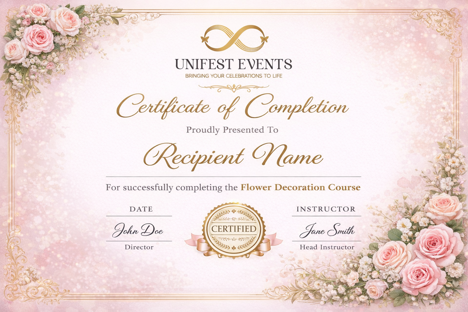 Our 30-day professional offline training program is designed to provide complete practical knowledge in flower decoration. Conducted at the Unifest Events Workshop, this course focuses on hands-on experience, real-event setups, and business guidance to help you confidently start your decoration career.